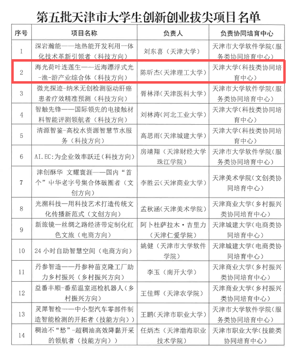 日前,天津市教育两委公布了2025年度天津市大学生创新创业拔尖项目立项名单,我校海洋能源学院项目《海光荷叶连莲生——近海漂浮式光-渔-游产业综合体》获批科技方向拔尖项目立项。