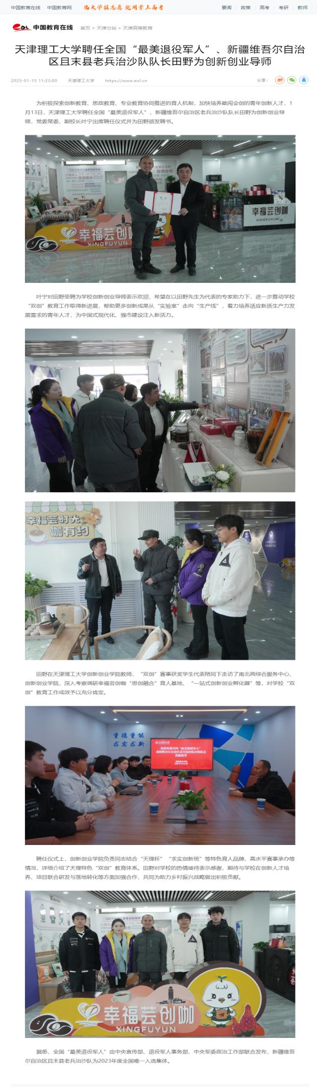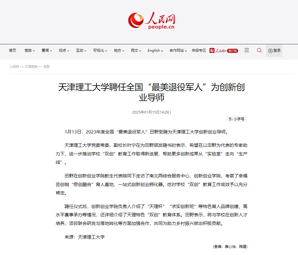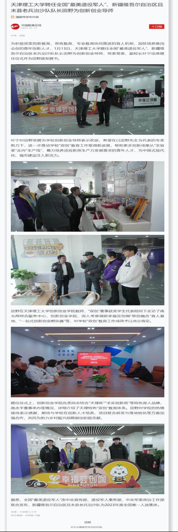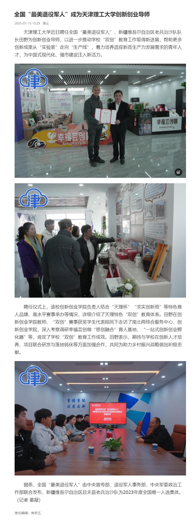 近日,人民网、学习强国、中国教育在线、津云等媒体聚焦报道我校聘任全国“最美退役军人”、新疆维吾尔自治区且末县老兵治沙队队长田野为创新创业导师。