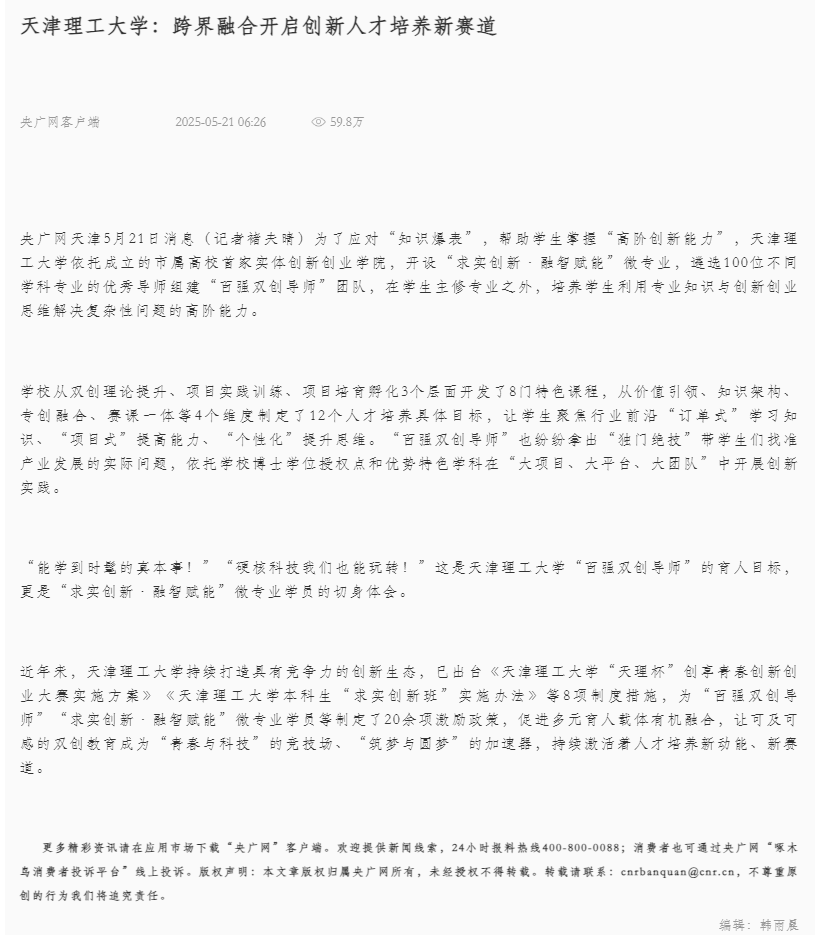 媒体聚焦丨央广网报道我校跨界融合开启创新人才培养新赛道